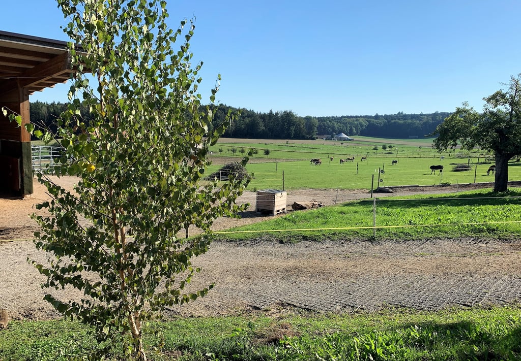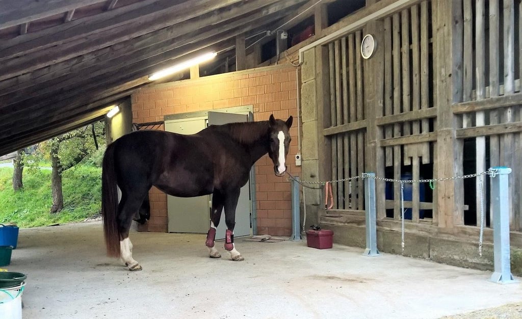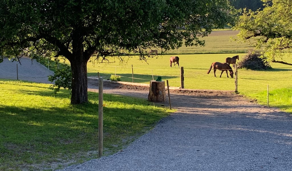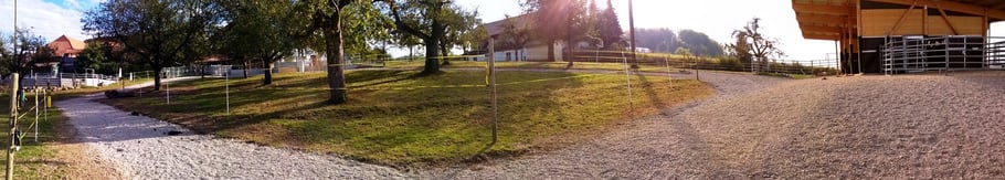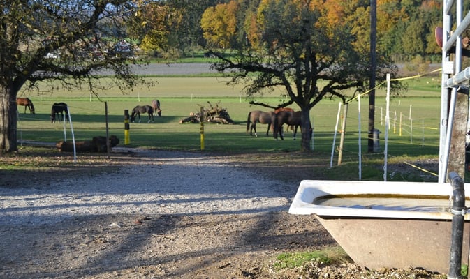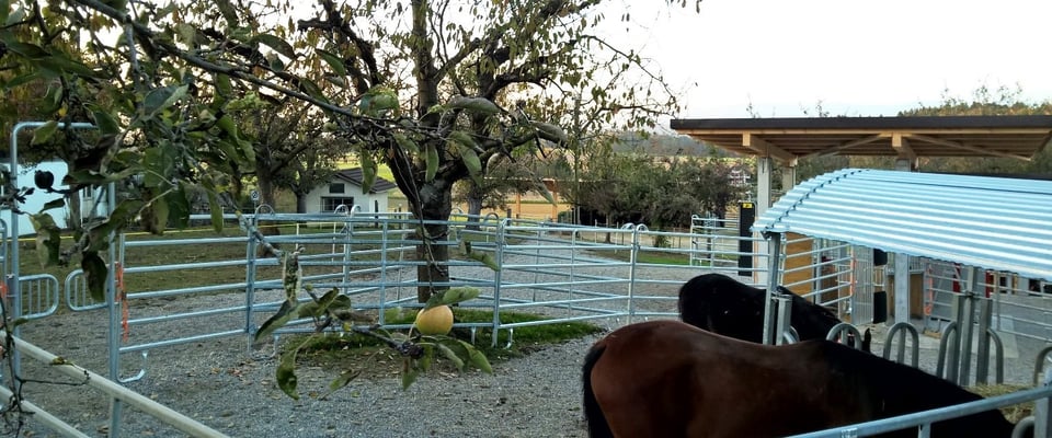 Die angrenzende Weide ist bei trockenen Boden- und Witterungsverhältnissen geöffnet, dies auch im Winter bei gefrorenem Boden oder genügender Schneemenge. An heissen Sommertagen wird von Tagesweide auf Nachtweide gewechselt. Das Pferd kann folglich jederzeit selber entscheiden wo es für ihn am besten passt.