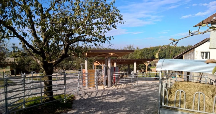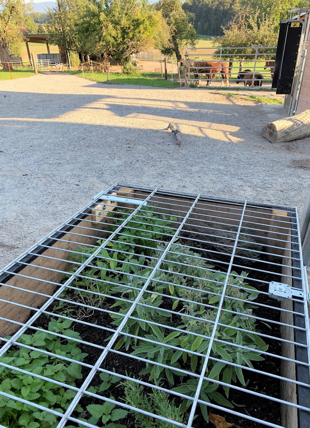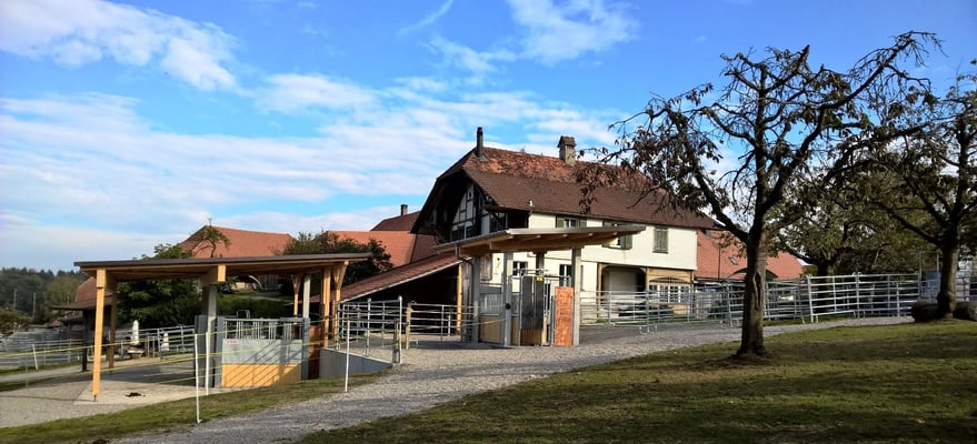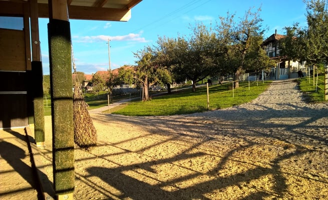 Die angrenzende Weide ist bei trockenen Witterungs- und Bodenverhältnisse für die gesamte Herde so oft wie möglich offen. Normalerweise als Tagesweide oder an heissen Sommertagen auch als Nachtweide.