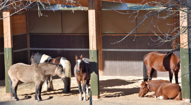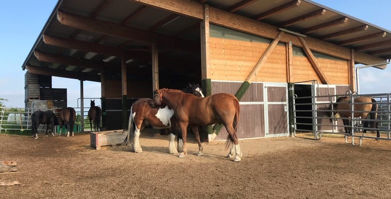 Der Gruppen-Fressbereich ist komplett überdacht sowie auch hier sind die Stützpfeiler mit den von den Pferden beliebten Kratzmatten überzogen.