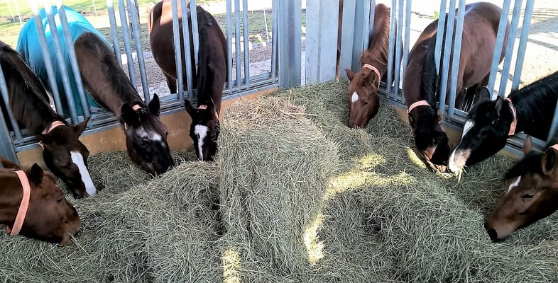 Mittels Chip an den Halsbänder erhalten die Pferde deren zugeteiltes Kraftfutter und werden je nach individueller Steuerung (zeitlich) in den Bereich mit einer weiteren Heuraufe geleitet, welche die zusätzliche Heufütterung der betroffenen Pferde erlaubt.