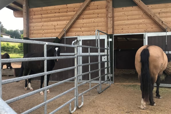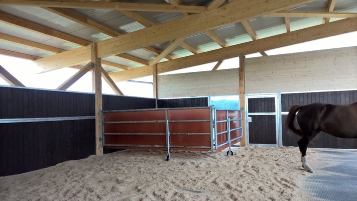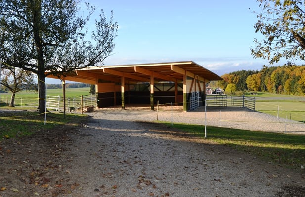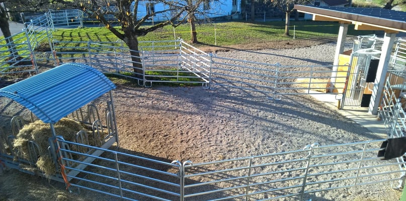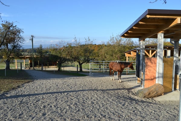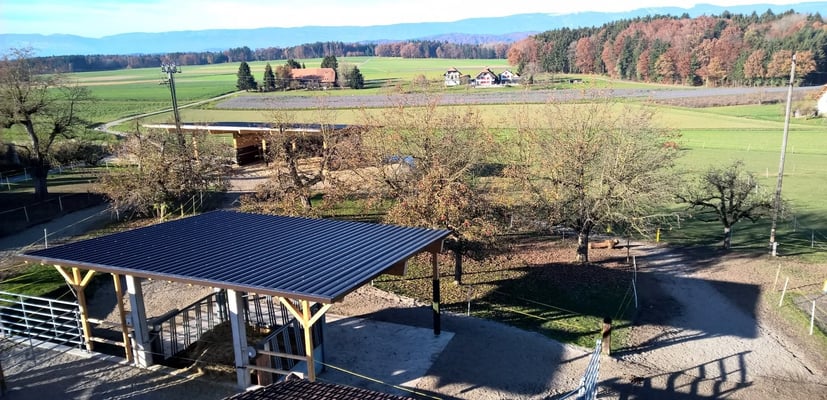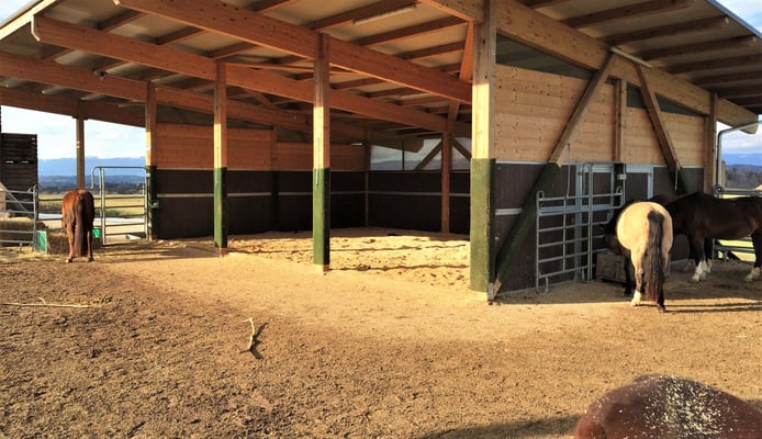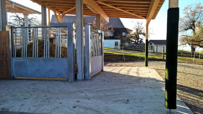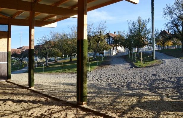 Der Bewegungsstall umfasst grosszügige befestigte Auslaufflächen, verschiedene Laufwege zu den Futterplätzen wie auch Liegehalle, damit die Pferde optimal bewegt sind.