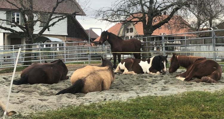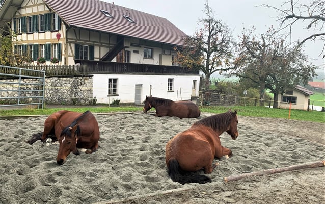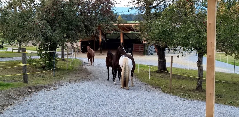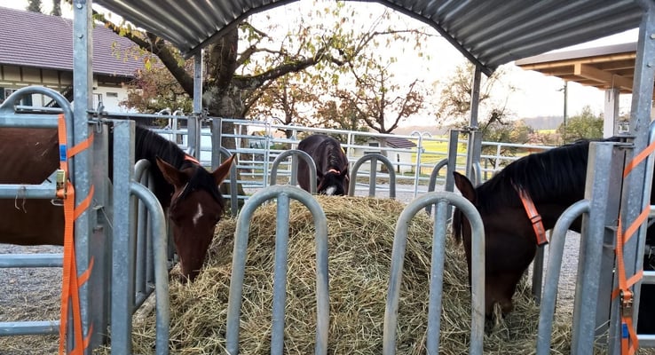Die Pferde leben zusammen in einer gemischten Herde mit Bewegungsmöglichkeiten dank Funktionsbereichen. Die Stationen Raufutter, Kraftfutter, Wasser, Liegebereich und ein weiterer individueller Bereich mit einer zusätzlichen Heuraufe sind an unterschiedlichen Standorten erreichbar. Dank der zeitgesteuerten Heufutterraufe welche regelmässig geöffnet aber auch wieder geschlossen wird, werden die wichtigen Bewegungsanreize geschaffen. Die Dauer dieser dortigen Fresszeiten werden dem jeweiligen Witterungen, Jahreszeiten sowie Weidegang periodisch angepasst.