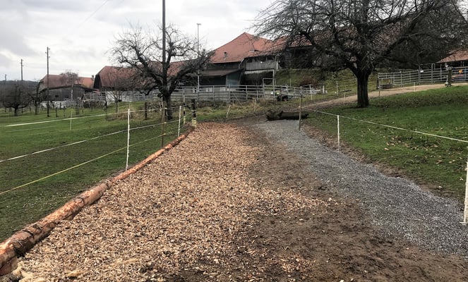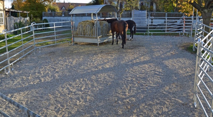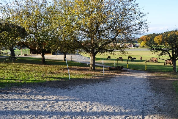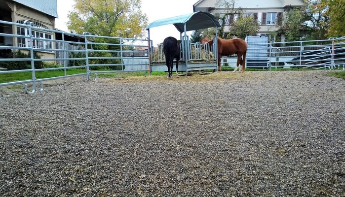12 Pferde erbauten Bewegungsstall über 1400 m2 an dauerhaft befestigten Flächen und Laufwegen zur Verfügung.