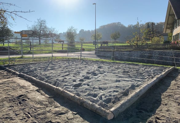 Auf dem höchsten Punkt der Anlage befindet sich ein grosser Wälzplatz (45 m2) welcher bei der Pferden sehr beliebt ist, nicht nur für wälzen sondern auch fürs schlafen.